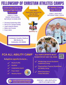 480 Butler St. Coldwater, OH 45828 | 7FCA CampsFCA Camps We are excited to be doing two Fellowship of Christian Athletes camps in one: A Leadership camp to pour into our teen volunteers and the All Ability Camp itself. This will take place on Friday evening June 6. Cost is free.